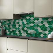 Alloy in Emerald Scallop is a splashback designed to look like scalloped tiles in light, mid and dark greens, offering all the beauty of intricately shaped tiles with none of the mess or grout. Transform your kitchen with the new rich natural textures of the Alloy Decor Range.